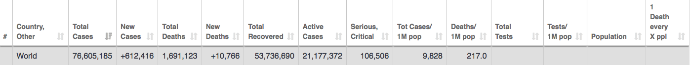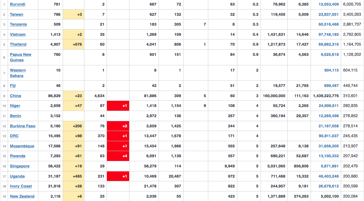 I have left this question of diagnostic reliability out of my own look at relevant issues – at least for now. I personally feel that the number of deaths attributed to COVID-19, relative to the country’s population, is a more useful measure. So, after playing around with some the settings in this very useful worldometer chart system, I clicked to add a column that is not part of the default settings, called “1 Death every X ppl”.