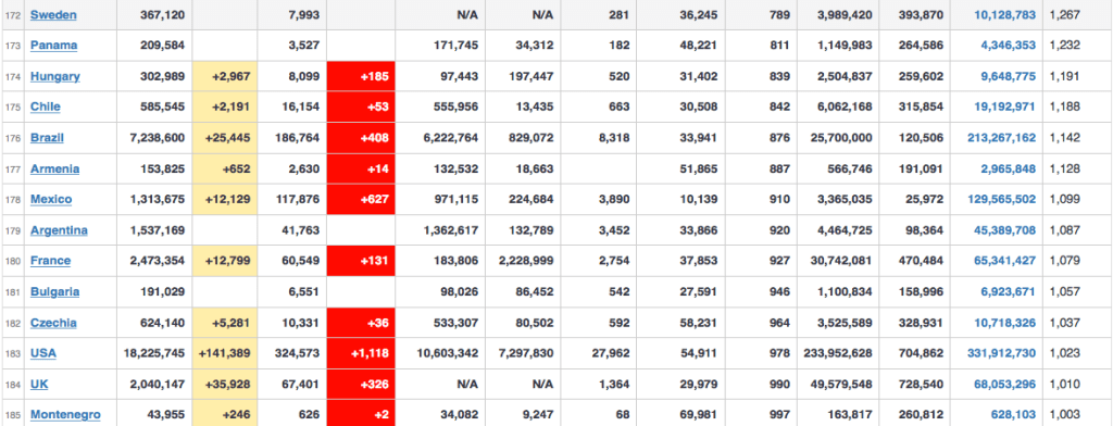 That added column appears on the right in each of the captured excerpts I have pasted in below. The first chart is how it appears (minus that “1 Death every X ppl column) when you first log into the worldometer countries chart for COVID. The 18 countries topping the list in that first chart are in order of largest number of Total Cases, the USA at the top.