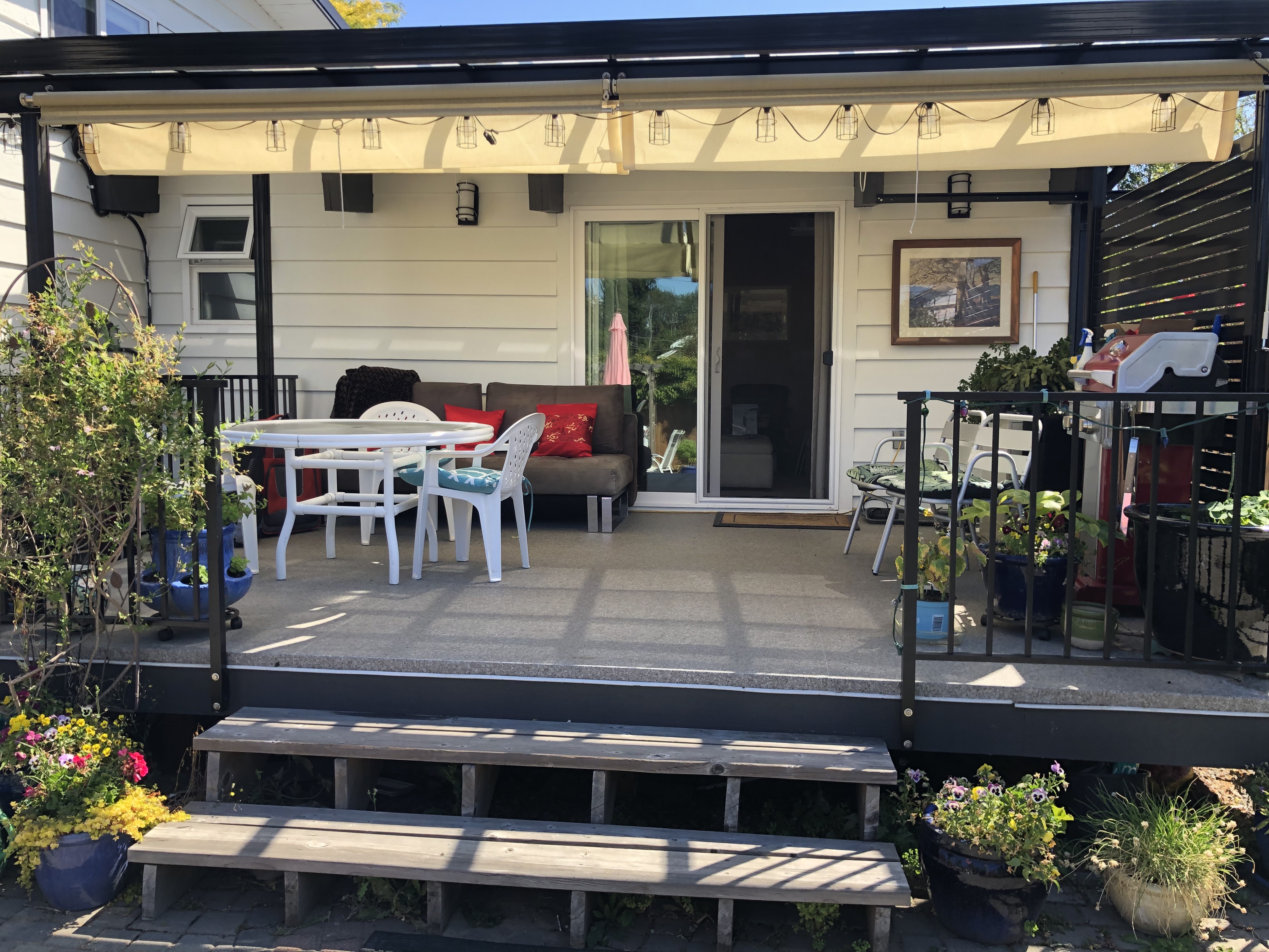 Please park on the same side of Magdelin as our house if possible. And if you must park on the opposite side of the road, please leave at least five feet between your vehicle and the neighbour’s driveway directly across from ours. As my sign says, go up the driveway and through the gate to the left of the house to reach the clinic.The clinic entrance is through the sliding glass door you see on this back deck. You’re welcome to sit on the back deck if the weather is nice. Otherwise, please enter and take a seat in the waiting area just inside the sliding door. Washroom is to your left inside the door.